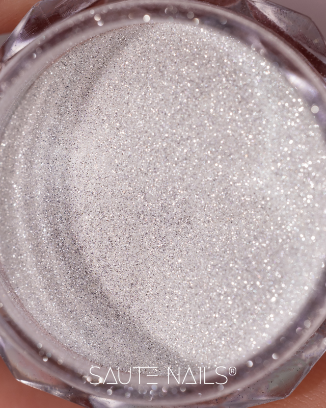 Siren's Kiss è una polvere finemente macinata con una finitura a specchio che crea una superficie argentata e intensamente scintillante sulla superficie dell'unghia.