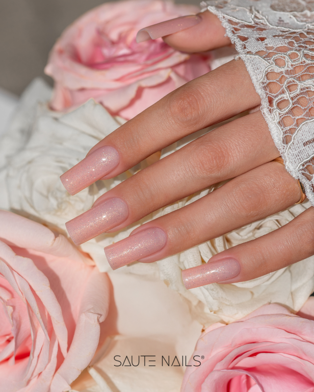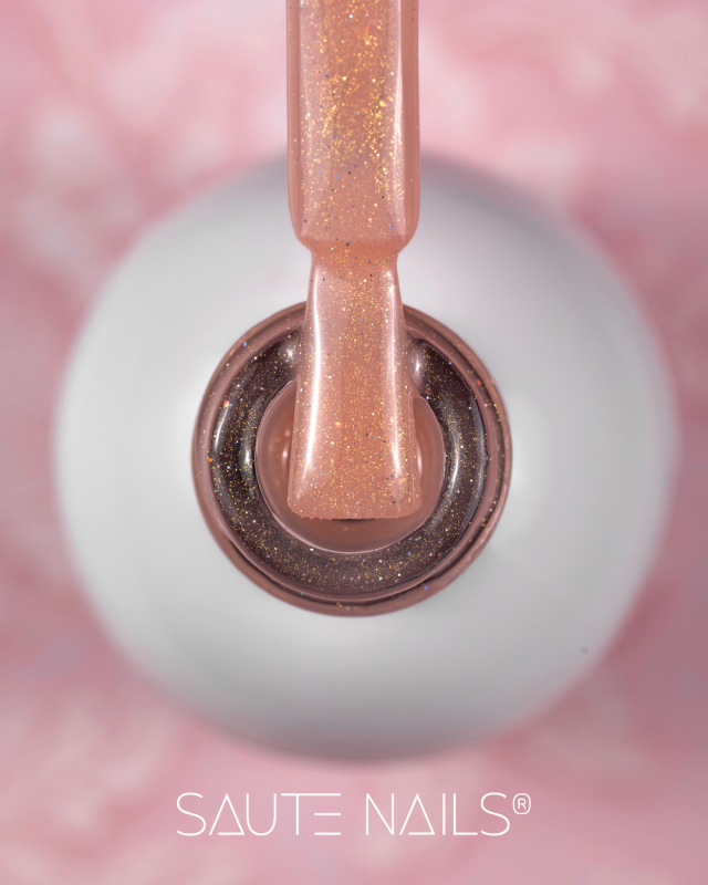 Smalto ibrido S317 Stardust Kiss in una tonalità semitrasparente di beige caldo con particolari particelle dorate e riflessi multicolori, una base ideale per la nail art French o Baby Boomer e per uno stile elegante e luminoso.