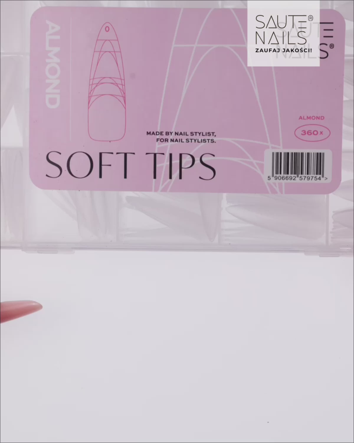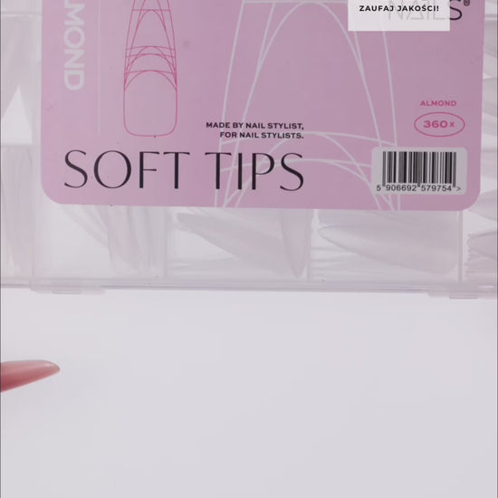 Le soft tip a mandorla sono punte extra lunghe a forma di mandorla, con fori per facilitarne l'accorciamento e la regolazione. Realizzate in materiale flessibile, sono disponibili in un colore trasparente opaco, 360 pezzi in 15 misure.
